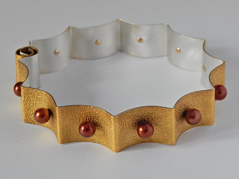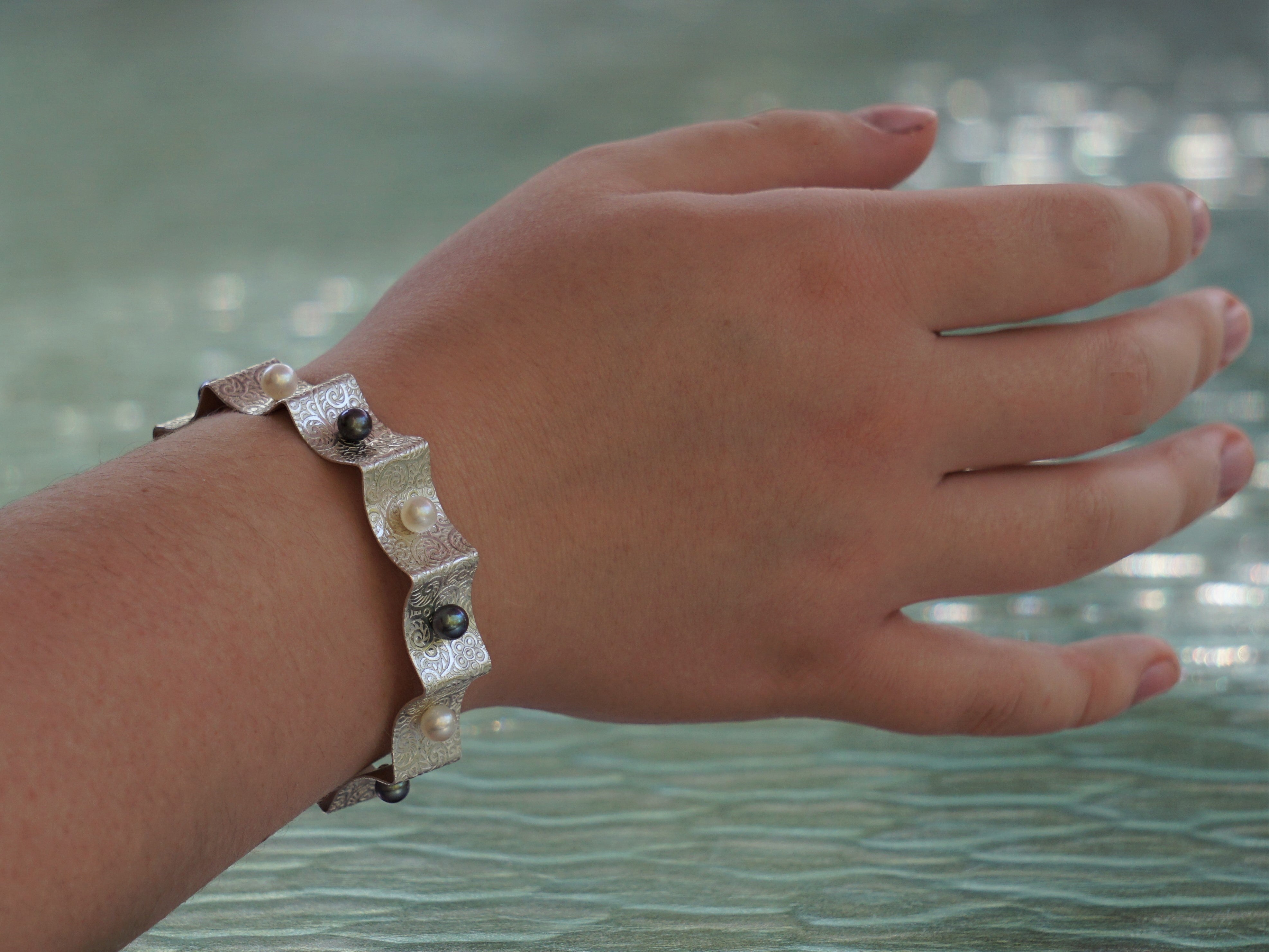 These crepe fabric patterned sterling bracelets are wearable art for your wrists and are so much more than any bangle or cuff bracelet! I designed and formed these bracelets with an integral clasp for a proper fit, and secured wear, for your wrist! These unique bracelets fit gently around your wrist, not oversized to fit over your knuckles, nor open ended causing constant squeezing to keep tight on your arm. The cultured pearls in this Ruffled Bracelet collection add color and detail to these fashion statements, and are available in black, white, bronze, or natural pink and peachy tones.
