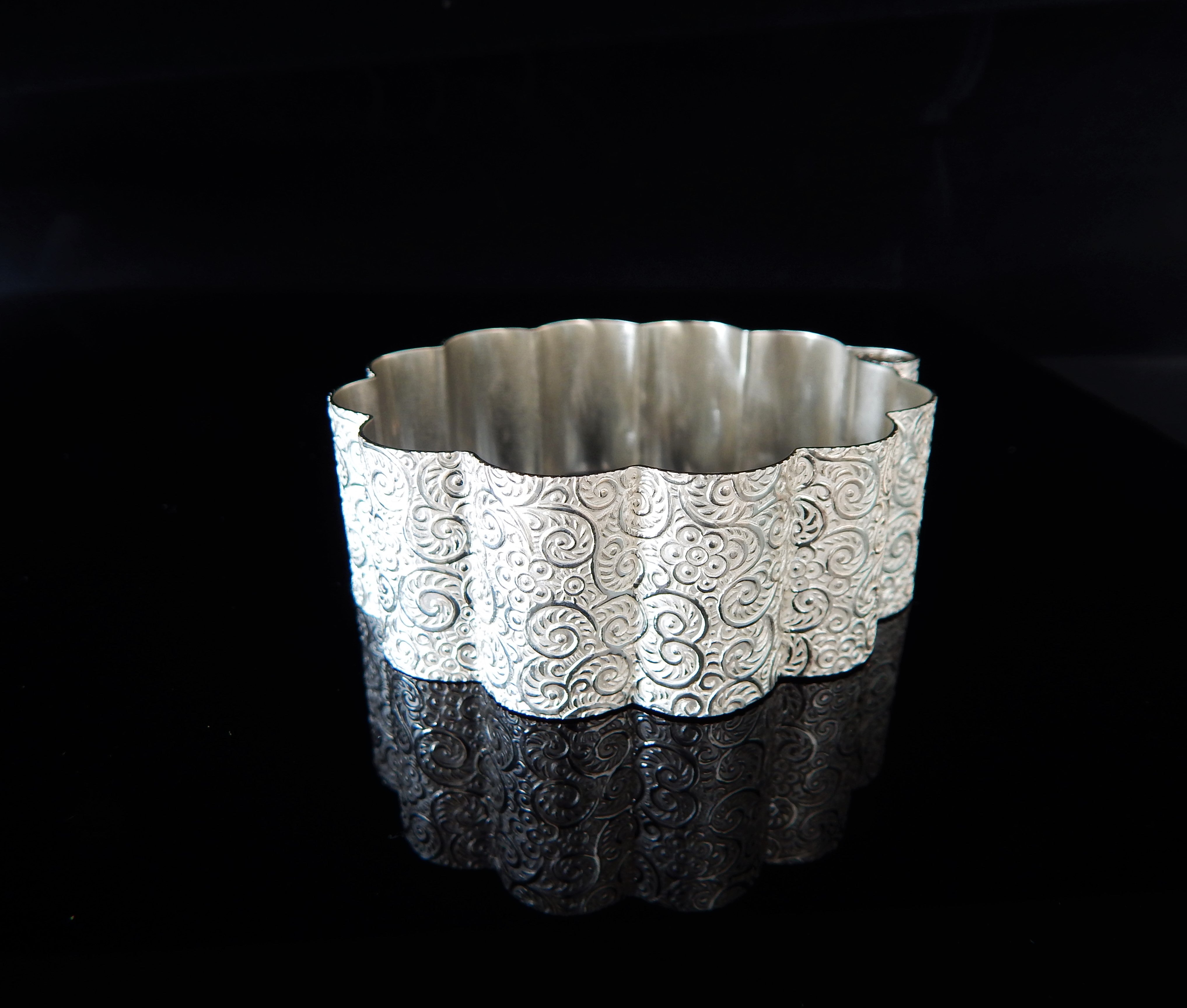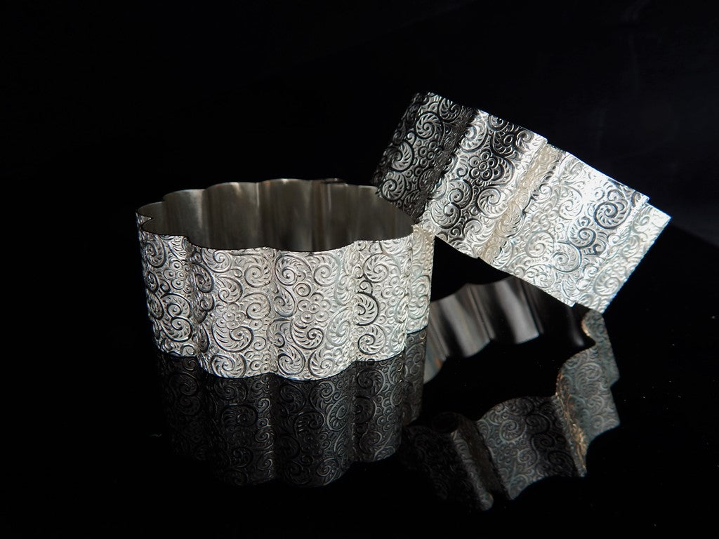 These "paisley" fabric patterned sterling bracelets are wearable art for your wrists and are so much more than any bangle or cuff bracelet! I designed and formed these bracelets with an integral clasp for a proper fit, and secured wear, for your wrist! These unique bracelets fit gently around the wrist, not oversized to fit over your knuckles, nor open ended causing constant squeezing to keep tight on your arm.