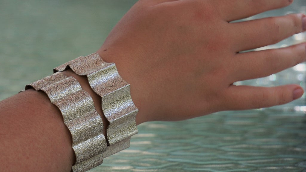 Ruffled Bracelet collections are architecturally inspired designs, that are strong yet lightweight, because this work hardened sterling has a tension memory that keeps the bracelet's shape. I like to wear them stacked with other Ruffled bracelets I create! They are so easy to put on and take off, with one hand, by yourself, please watch the video to learn how! All bracelets are spray lacquered for tarnish resistance...for you, and the sterling is purchased from a sustainably sourced USA metal supplier.